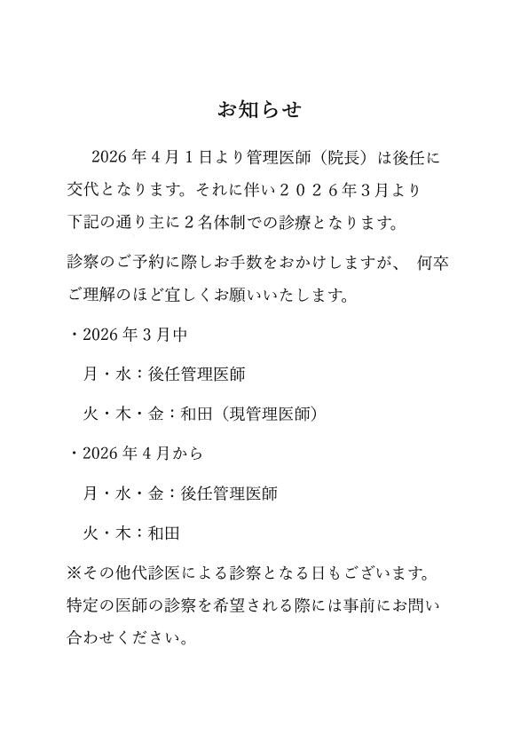 - 1月 休診・代診のお知らせ■ 休診日 下記の日程は休診となります。 1月17日(土) 1月31日(土) ■ 代診日 下記の日程は代診医に… 続きを読む: 1月 休診・代診のお知らせ