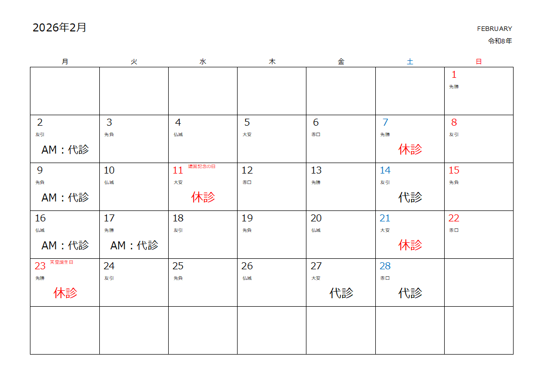 - 2月 休診・代診日のお知らせ■ 休診日 下記の日程は休診となります。 2月7日(土) 2月11日(水・祝) 2月21日(土) 2月23日(… 続きを読む: 2月 休診・代診日のお知らせ
