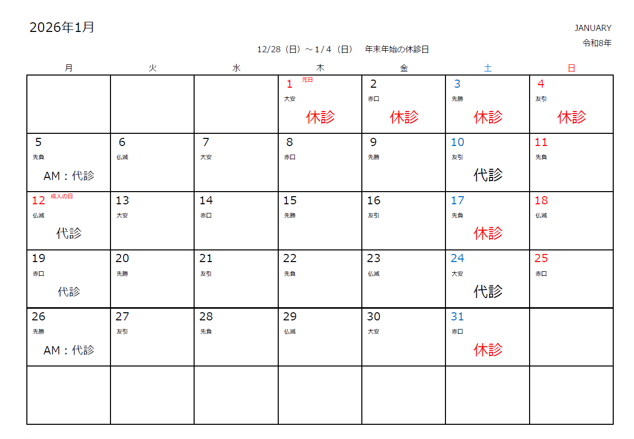- 1月 休診・代診のお知らせ■ 休診日 下記の日程は休診となります。 1月17日(土) 1月31日(土) ■ 代診日 下記の日程は代診医に… 続きを読む: 1月 休診・代診のお知らせ